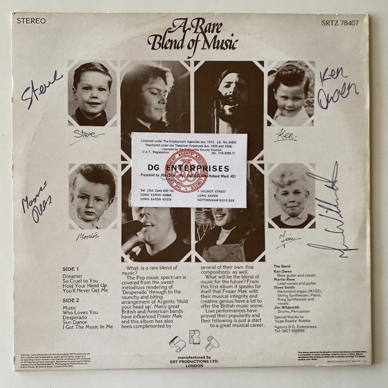 Strange Days/England Garden Shed-style late symphonic/melodic Private UK prog quartet with lots of organs and synths. Mixture of self-composed tracks like the outstanding ‘Sun Dance’, which sounds uncannily like an outtake from Garden Shed and which was comped a few years ago, and covers that include a powerful adaptation of Argent’s ‘Hold Your Head Up’. Fairly basic front sleeve with band photo and name plus the slogan ‘A Rare Blend of Music’. Very limited vanity label issue, best copy I’ve seen, autographed on back by all Band members and a never seen card business card of the agency representing the band...Pokora 7001 R4