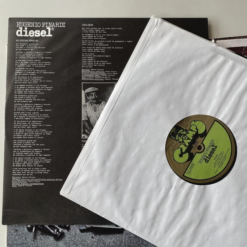Italian avant prog pop on cult italian label, Fariselli on keys, , lyric inner SIAE stamp ...Gatefold cover , front M-, back EX ( very faint rw), record M-, probably unplaayed