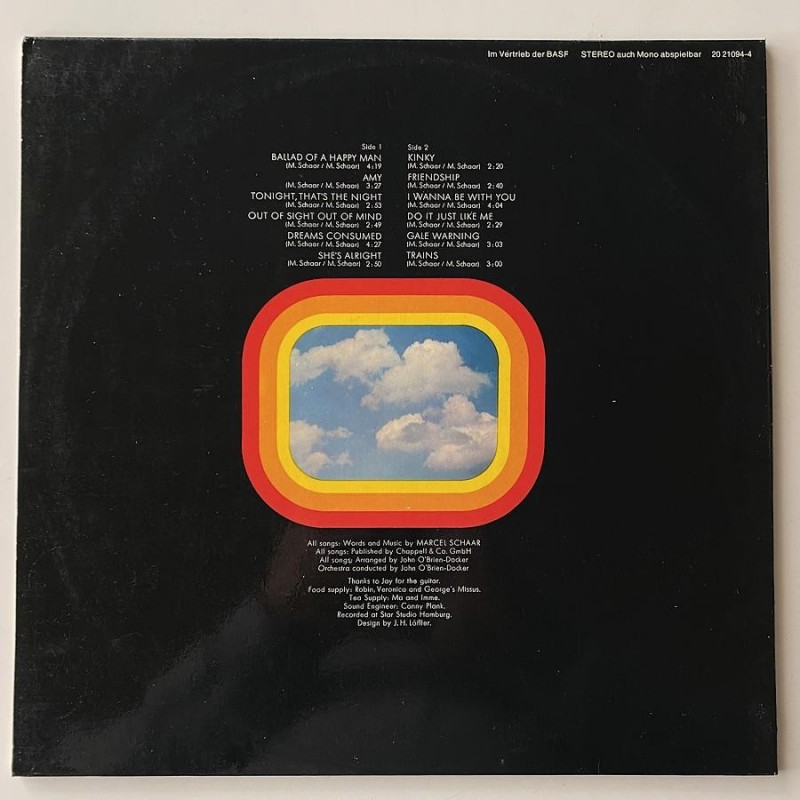 Dreamy orchestrated german pop prog singer ( Marcel Schaaf) ,sung in english, Scott Walker reminiscences, with my fave psych track with phasing and sitar "Gale Warning" and the production of O'Brien-Docker (ex-Die City Preachers, later Brave New World member) and Conny Plank... laminated gatefold first press M-/M- copy ( no poster)