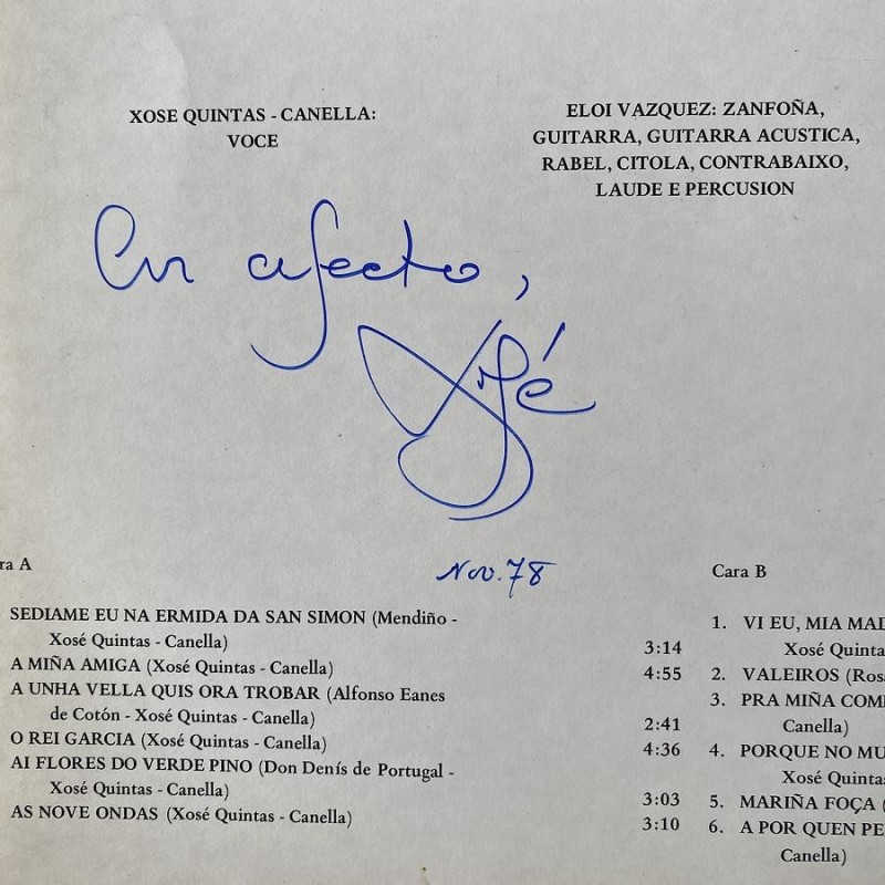 One of the best ancient medieval prog folk albums from Spain, featuring Eloy & Anxel ( pre- DOA) recommended! ! Pokora's 7001 top 10 favourite and EX/EX+ condition, dedicated by Xose Veloso inside gatefold