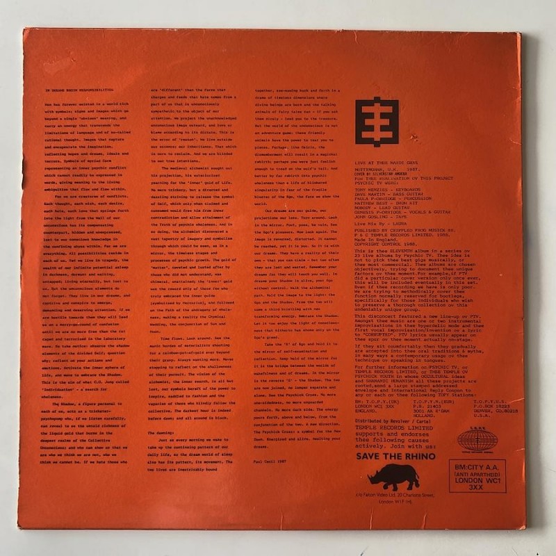 This is thee ELEVENTH album in a series ov 23 live albums by Psychic TV. First press strong EX/EX copy