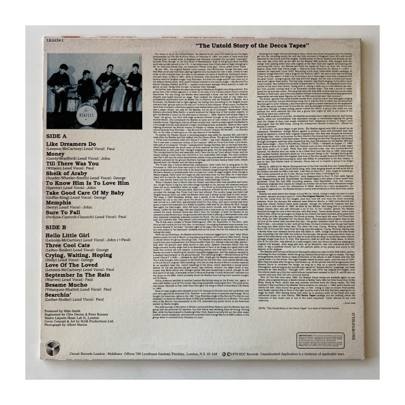 Unofficial recordings, white label, mono…The Decca sessions, recorded on 1 January 1962 in West Hampstead. The 1979 release seems to have come from a tape gifted to a third party in the 1960s by Brian Epstein. The Beatles have owned the tape since the 1980s and took legal action confirming that they owned the copyright in 1989.